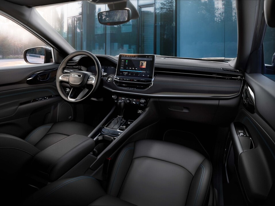 A spacious cabin greets anyone who slides into the Jeep® Compass. Premium materials, such as leather-trimmed seats and soft-touch surfaces, create a refined ambiance. The 10-way power driver's seat with lumbar support allows you to find your ideal driving position, while the dual-zone automatic climate control ensures personalized comfort for both driver and passenger.